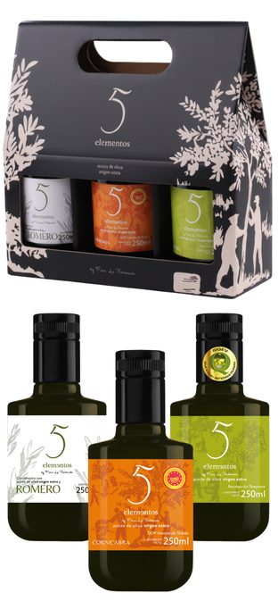 5 Elementos Estuche 3×250 ml es una invitación a descubrir la esencia del AOVE premium a través de dos monovarietales excepcionales: Cornicabra con DOP Montes de Toledo y Picual, junto a u nuestro nuevo condimento a base de aceite de oliva virgen extra con Romero. Cada aceite refleja el carácter único de su variedad, con matices que seducen los sentidos y elevan cualquier plato.